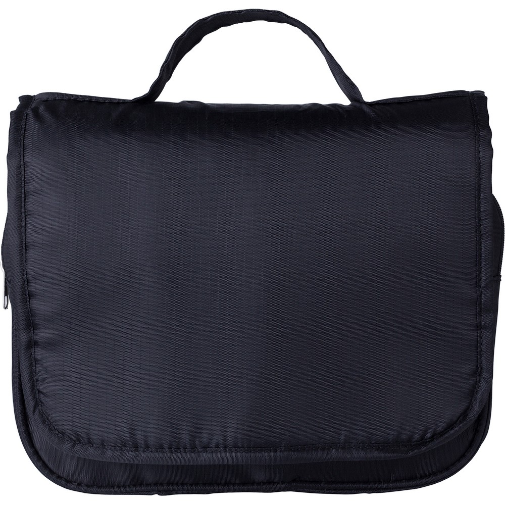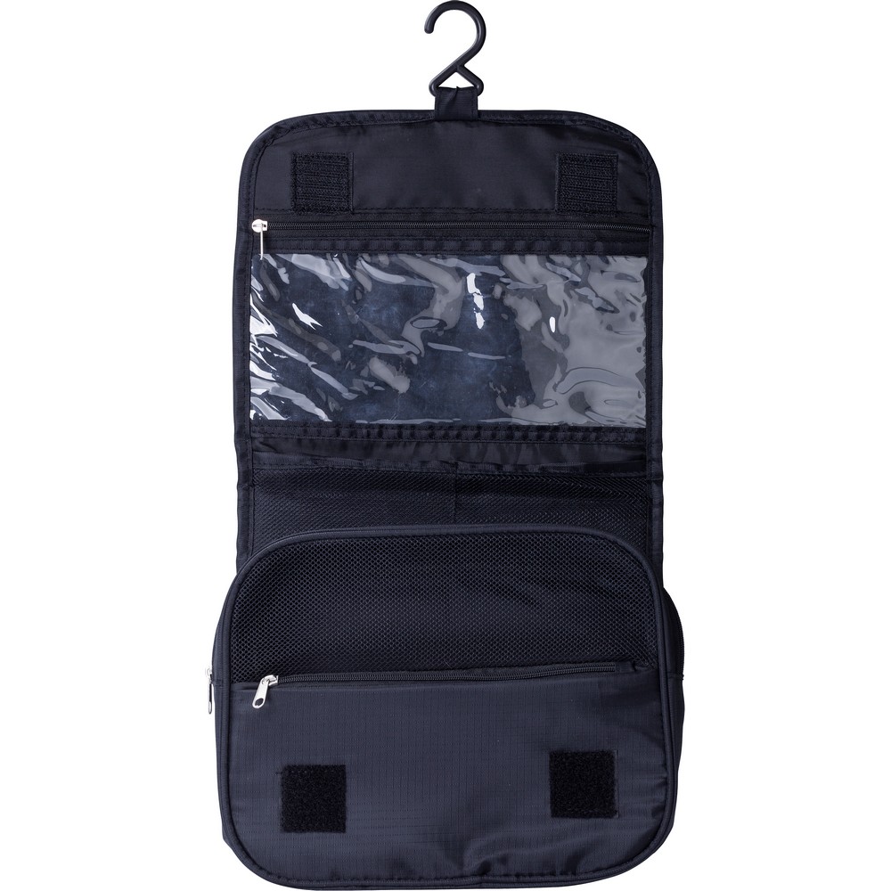 Entdecken Sie die perfekte Kosmetiktasche für Ihr Marketing: Diese elegante, schwarze Travel Cosmetic Bag vereint Funktionalität mit Stil. Mit praktischen Innenfächern – darunter eine große, netzartiger mit Reißverschluss, eine kleine und eine transparente Tasche – erleichtert sie den Alltag Ihrer Kunden, während der integrierte Haken vielseitige Aufbewahrungsmöglichkeiten bietet.